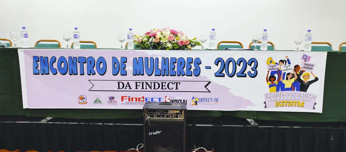 A FINDECT deu continuidade ao seu Congresso com um Encontro de Mulheres no período da tarde do dia 17/05. O evento teve início com a formação da mesa pelas diretoras das pastas das mulheres de cada sindicato filiado à FINDECT. A mesa foi composta por Telma Milhomem, secretária da mulher da FINDECT, Rose Leodoro, suplente, Amanda do Maranhão, Rita, secretária da mulher de Bauru, Débora, secretária pelo Rio de Janeiro e Márcia Lane do Tocantins.