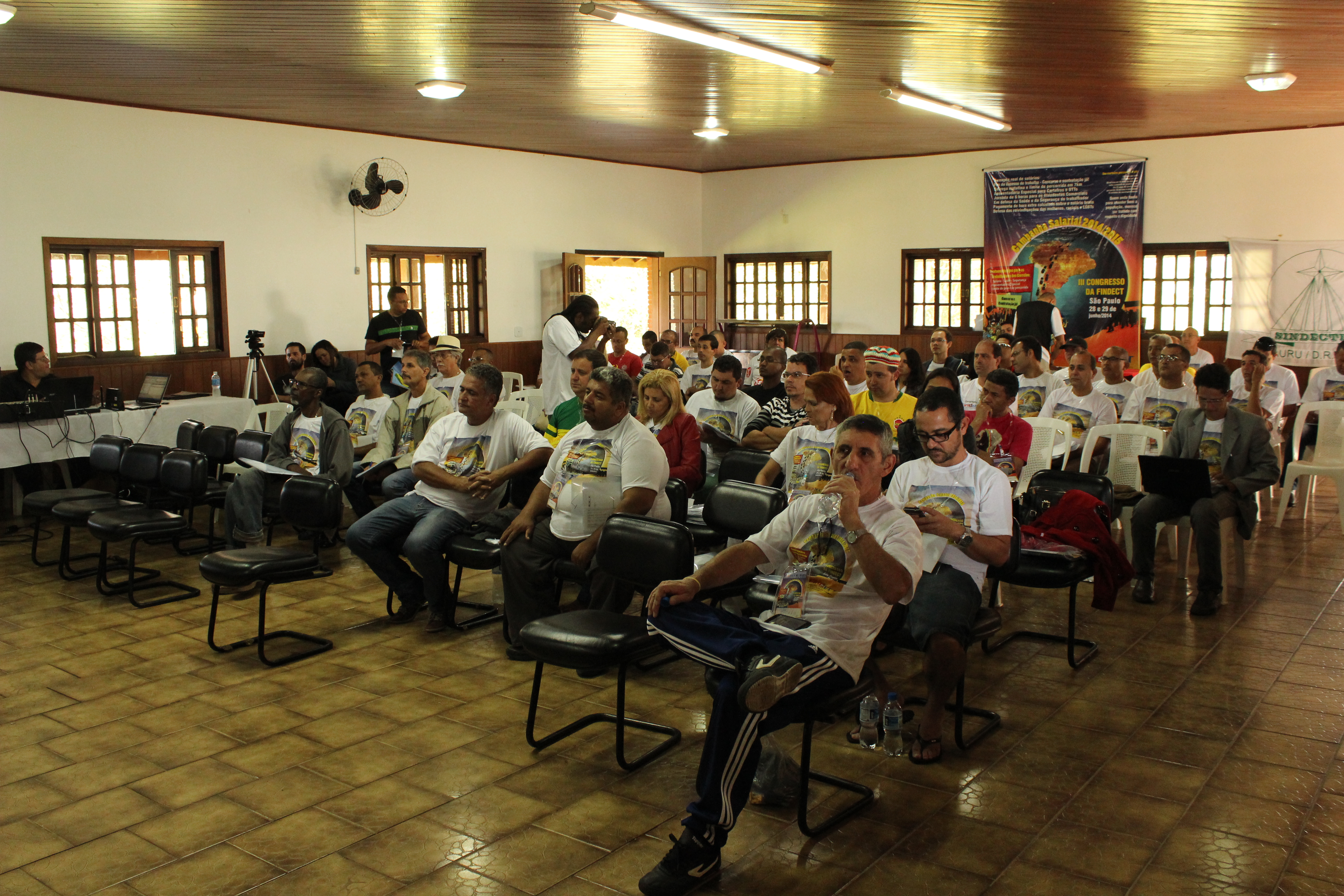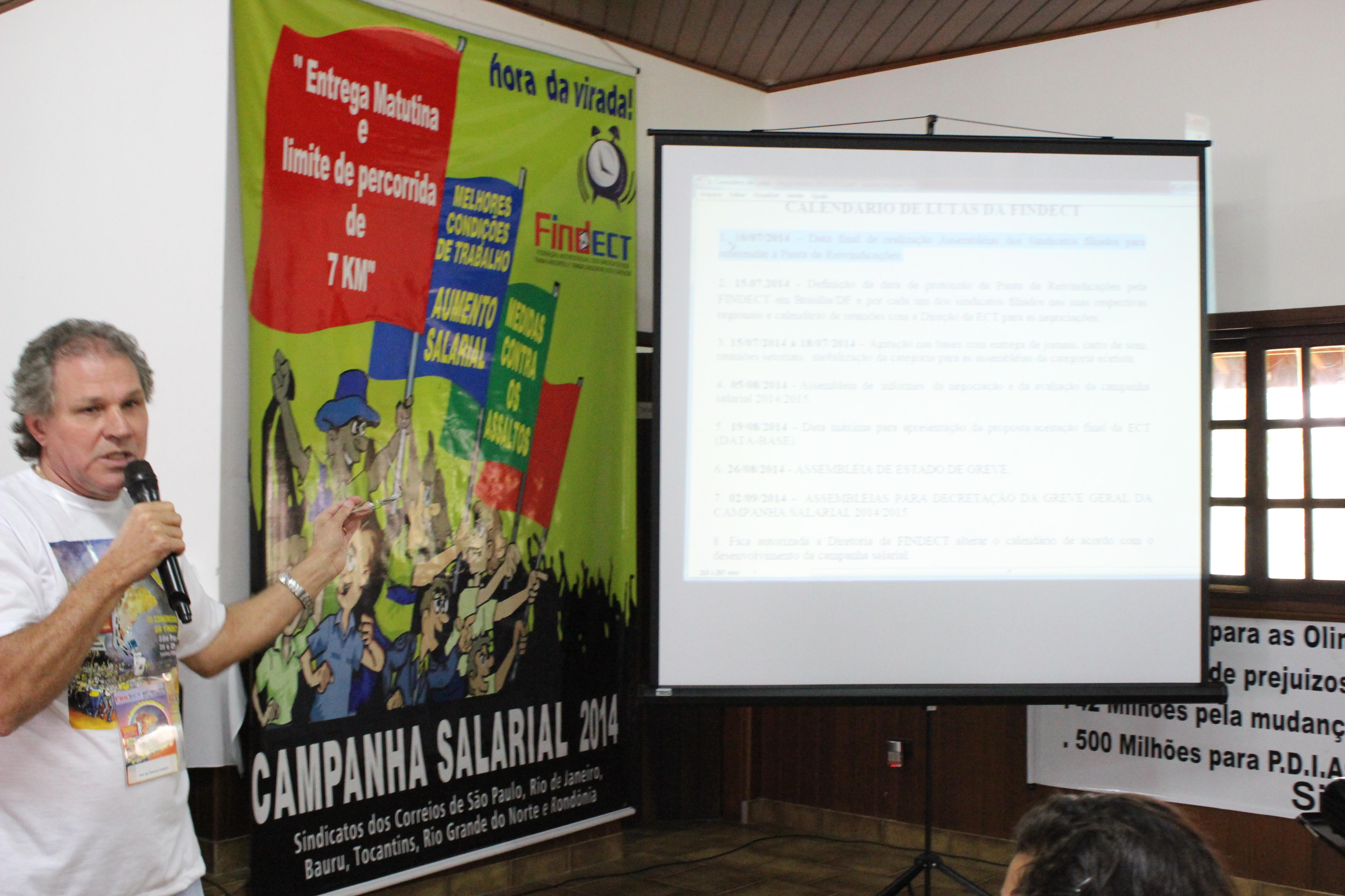 Após o intervalo para o almoço, os companheiros retornaram à plenária para ouvir a exposição do representante do DIEESE, Roberto Sugiyama, que falou sobre a atual situação econômica e política do país e, os seus reflexos na Campanha Salarial. Alertou que será uma campanha dura e complicada, mas que, com a mobilização e unidade da categoria, assim como a atuação da Diretoria da Federação junto aos órgãos governamentais, conseguiremos abrir portas para um Acordo Coletivo que satisfaça a categoria.