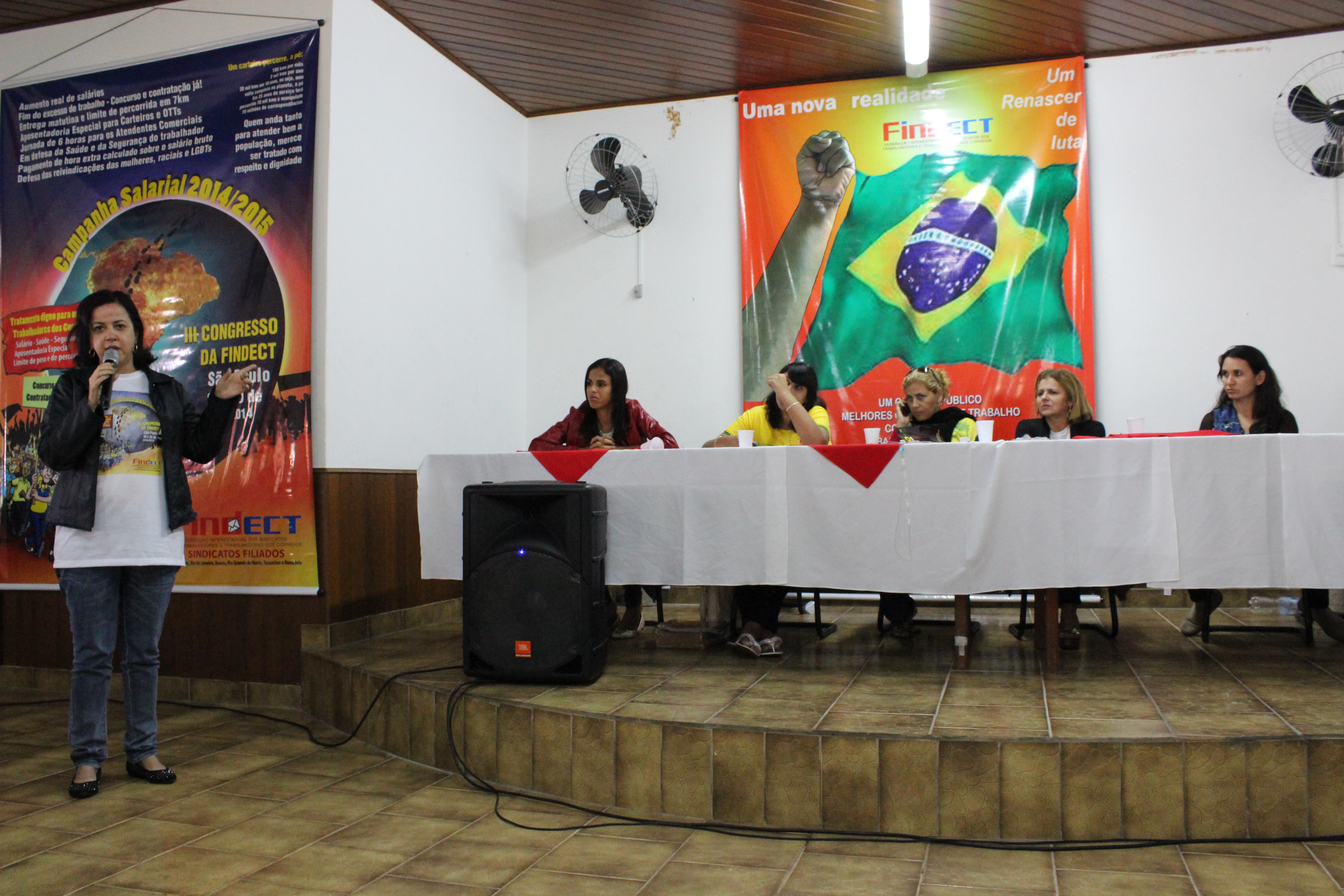 Foi coordenada pela Companheira do Tocantins, Telma Milhomem Borges, Diretora de Políticas para as Mulheres da FINDECT. Participaram da mesa representantes mulheres dos sindicatos que compõem a Federação, onde expuseram os problemas, dificuldades e reivindicações das Companheiras Ecetistas. São elas: